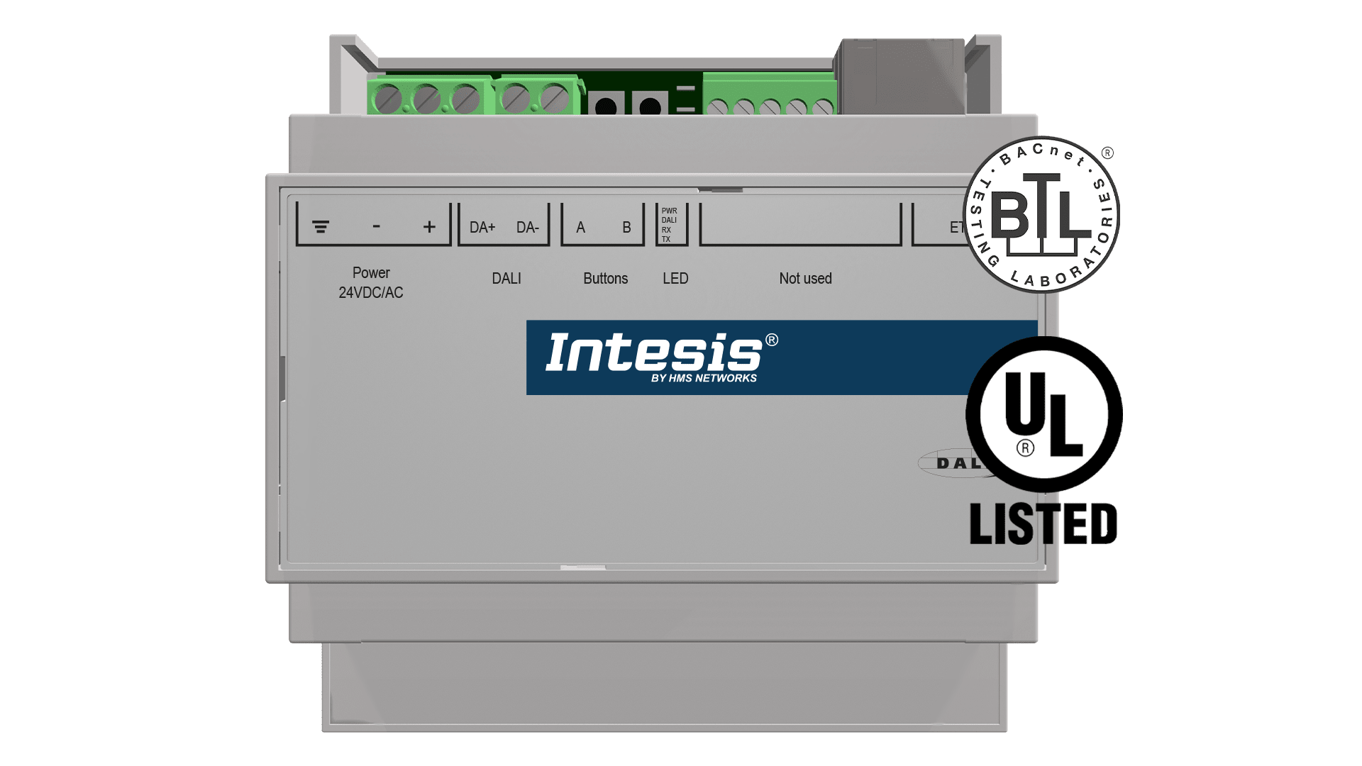 DALI-2 to BACnet/IP Server Gateway. Intesis protocol converter DALI-2 to BACnet/IP. Supports up to 64 DALI/DALI-2 drivers and DALI-2 light or occupancy sensors. One DALI-2 channel. Configuration and Diagnostic tool: Intesis MAPS. Scans DALI devices on the network to reduce configuration time. Export and import projects as xlsx files.