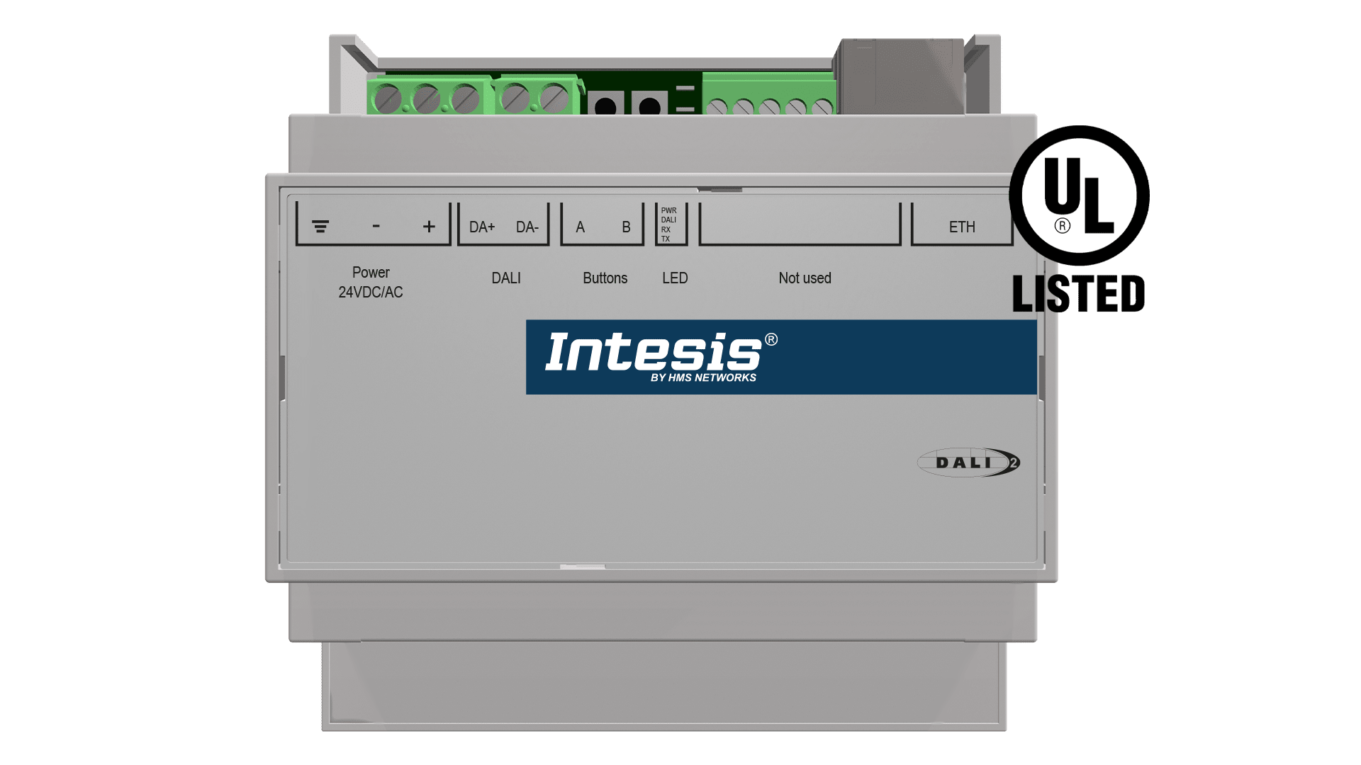DALI-2 to Modbus TCP Server Gateway. Intesis protocol converter DALI-2 to Modbus TCP. Supports up to 64 DALI/DALI-2 drivers and DALI-2 light or occupancy sensors. One DALI-2 channel. Configuration and Diagnostic tool: Intesis MAPS. Scans DALI devices on the network to reduce configuration time. Export and import projects as xlsx files.